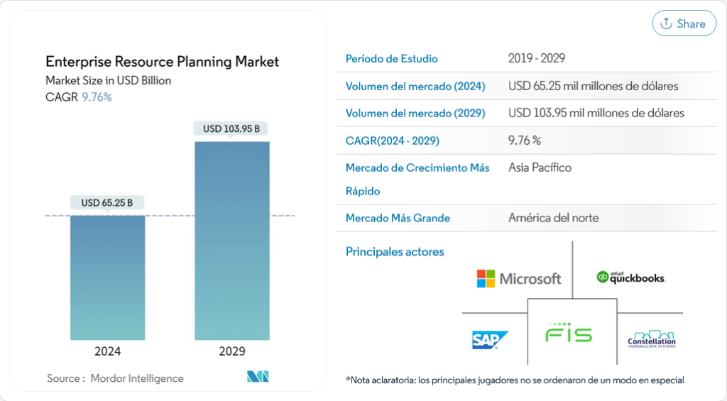 Fuente: Mordor Intelligence Research & Advisory. (2023, December). Análisis de participación y tamaño del mercado de ERP tendencias y pronósticos de crecimiento (2024-2029). https://www.mordorintelligence.com/es/industry-reports/enterprise-resource-planning-market